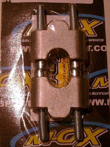 | Klemmsatz für dito,(SUZUKI+DRZ400) Die Schelle wird in die Originalaufnahme (Schelle) gelegt und montiert. Der Lochabstand zur Befestigung auf Deiner Lagerschale beträgt 34-37mm (M8)der Lenker wird draufgelegt dann folgt die letzte, obere Schelle.Die passt dann sowieso. Durch diese Aktion kommt der Lenker cirka 10mm höher. |