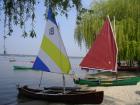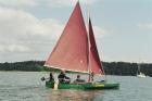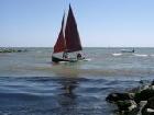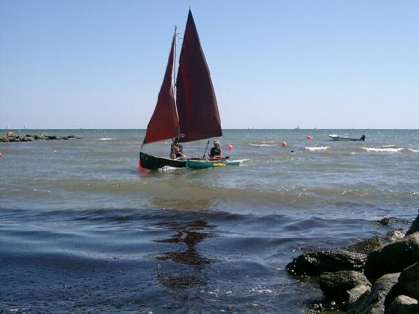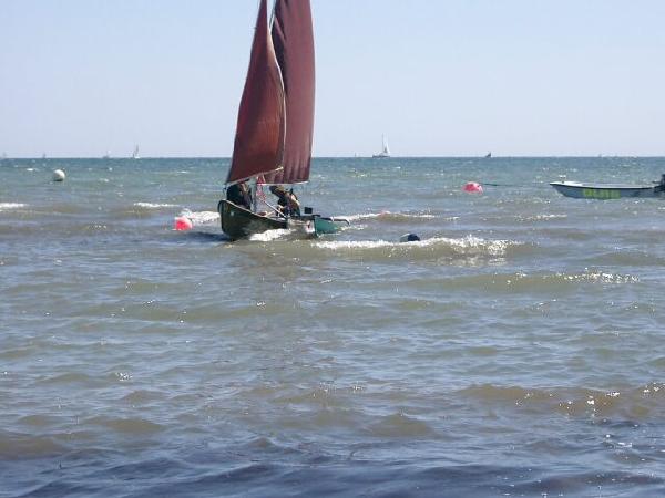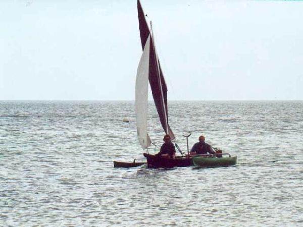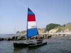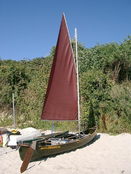 Lugger Großsegel und Fock. Das Boot ist mit unserem Rigg super in der Steuerung balanciert. Es reagiert wie eine Jolle auf das Ruder Der 2.Schwimmer bringt mehr Sicherheit, aber auch mehr Gewicht. Das Boot ist mit nur einem Schwimmer sehr Dynamisch und es bleibt immer spannend bei 4-5 Windstärken, auflandigem Wind, irgendwann im August auf der Ostsee. Wassertemperatur ,cirka 25Grad. Spaß Pur. Sinnlos vorm Strand die größten Wellen suchen und zu versuchen das das Boot möglichst lange mit angehobenem Schwimmer zu fahren. Gigantisch. Hi,Hi. Jede Variante hat etwas neues zu bieten. |