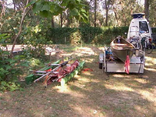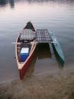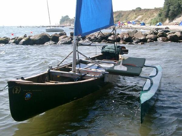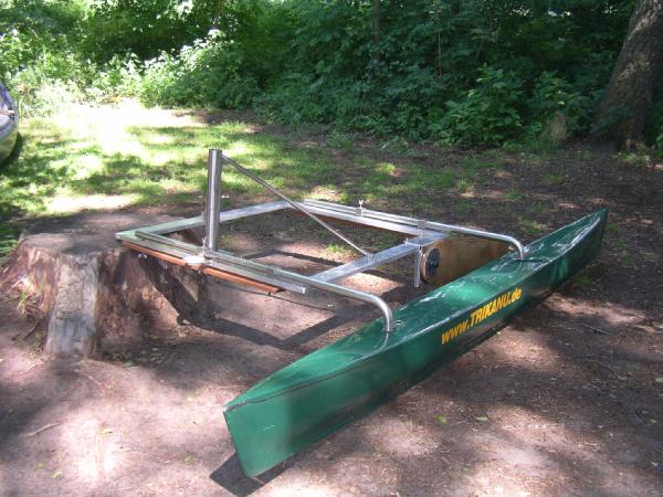 - Segelaufsatz. Für Segler die gern paddeln. Zwei Schwimmer (wie bei einem Katamaran) Ein Rohrgestell aus Nirostastahl 15Kg. verbindet beide Schwimmer, fixiert den Mast, den Schwerthalter und die Wanten. Der Aufsatz wird mittels Gurten und eingeklebten Blechen am Bootsrumpf fixiert. Die Schwimmer 13kg. werden seitlich herausgezogen. Ausgezogen erreicht der Aufsatz eine Breite von 3,00m.Mastlänge 4,80m, mit 4 mm Wanten verstakt. Der Mast klappt nach hinten auf eine Stütze. Das Vorstag wird am Bug befestigt, dort sollte eine Trageschlaufe genügend halt bieten . Der Alleskönner. Hiermit hat man natürlich alle Optionen und für Jeden Einsatzzweck das passende Gerät dabei. Besegelung: Luggersegel + Fock. Delta ist auch möglich. Oder ein vorhandenes Jollenrigg |