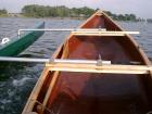 immer noch flott in Bewegung. Bei Wind wird der Mast nur einfach in die Halterung gesteckt. Dazu bieten wir ein Rigg mit Krebsscherensegel an, das wird am Mast fixiert. Keine Wanten, Leinen, Beschläge usw. erforderlich. Das ergibt eine Segelmöglichkeit mit nur einer Schot. Sonst nix. Das Gewicht beträgt 25. Komplett . Dieses mehr an Gewicht im/am Boot ist kaum spürbar und schnell demontierbar. Es kann alles im Boot verstaut sein und bei Wind wird mal kurz aufgeriggt. Dauer,ca.5-10 Min. Wir haben einiges probiert. Die Belastung für Boot und Rigg sind außerordentlich gering. Mit diesem Aufsatz kann man auch mal kurz den großen See verlassen und in Kleinstflüsse einfahren. Sollte der Schwimmer stören wird der auf das Boot gelegt. So bleibt alles Kanumäßig erhalten. Es besteht wie man sieht auch die Möglichkeit mal bei richtig Welle und auflandigem Wind zu paddeln und auf den Wellen zu surfen. Für ambitionierte Kanusegler kann das Boot auch ohne Schwimmer gefahren werden. Dann wird das Delta Segel mit tieferem Schwerpunkt gefahren und das Schwert sollte ausgeklappt sein. Mögliche Besegelungen: ab 4,5m², Optimistensegel, Delta/Banana Segel 6m², Surfsegel