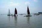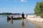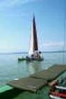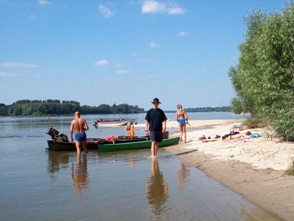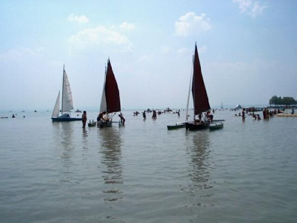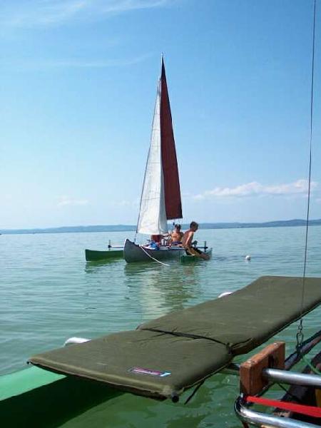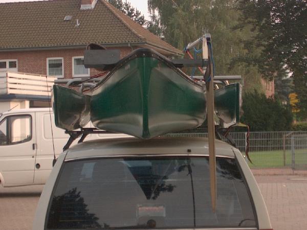 Nach einigen Monaten Winterarbeit stand nun im April 2001 der Segelaufsatz fertig da. Das Boot wurde mit Ratschengurten fixiert und es ging zum testen. In einer kleinen Bucht in Dänemark probierten wir es nun auf der Ostsee aus. Alles funktionierte wie erwartet - nur die Steueranlage – mein Paddel und dann ein Riemen vom Ruderboot stellten sich auf Dauer als unbrauchbar heraus. Es wurde für den nächsten Versuch die Ruderanlage einer kleinen Jolle probiert. Wir schraubten diese an die Motorhalterung des Kanadiers und fixierten das ganze hinter dem hinteren Sitz. Es funktionierte beim darauffolgendem Test auf dem Plöner See hervorragend. Den Sommer über war ich mit dem Boot auf dem Plattensee (Ungarn), der Donau, Ostsee, Elbe und auf der Müritzer Seenplatte unterwegs. Wir konnten das Boot mit einem kleinen Kanuwagen überall zu Wasser bringen, konnten vom Boot aus baden und bei 20 cm Wassertiefe segeln (dann wird mit hochgeklapptem Ruder oder Paddel gesteuert). Auf der Donau (Ungarn) und den zahllosen Seitenarmen fuhren wir mit 3 Erwachsenen und 2 Kindern mitMotor und Paddel auf Erkundungstour. |