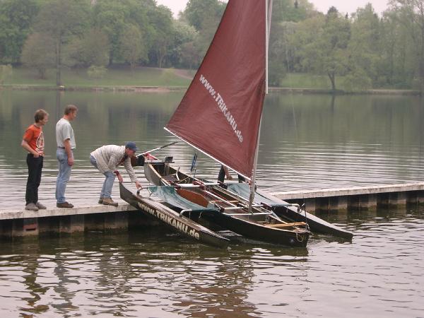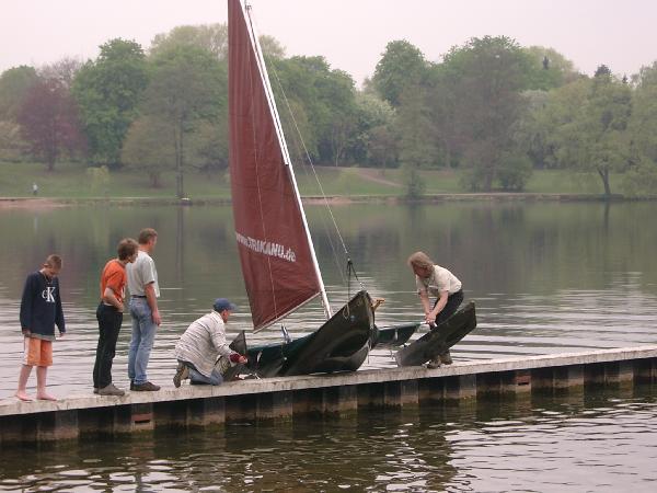 Wir haben uns für ein Luggersegel mit 5,5 qm + 8 qm entschieden, weil es für die Anforderungen (schnelles aufriggen usw.) am besten geeignet erschien. Die Fock wurde von verschiedenen Jollen ausgeliehen mit bis zu 4 qm ergab das eine Segelfläche von bis zu 12 qm gesamt. Der Mast wird einfach nach hinten auf eine Stütze geklappt (über Vorstak), wenn eine Brücke oder auch Bäume im Weg sind. GEWICHT und Transport Kein Teil ist schwerer als 16 kg. Der Aufsatz kann am Boot bleiben und kpl. auf den Anhänger oder das Autodach geladen werden. Sollte es zu schwer sein – es kommt natürlich auch auf das Eigengewicht des Bootes an – ist es kein Problem "mal eben" die Schwimmer mit je 13 kg. zu entfernen und nachdem das Boot aufgeladen oder umgetragen ist wieder einzustecken.Mein MAD RIVER Kanadier "Duckhunter" ist 5,30 mtr. lang. Bei einer Breite von 96 cm. Gewicht ca. 30kg. Zuladung bei 10 cm Freibord 500 kg. Das zweite Boot war ein ALU-Kanadier ca. 38 kg. Es wird KEINE Slipanlage benötigt.