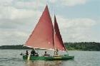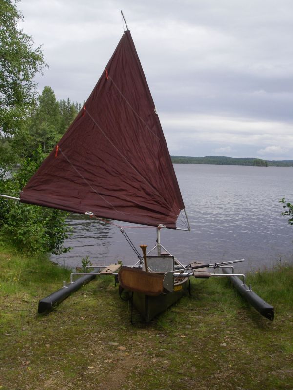 ca. 100kg. Ich habe es nicht gewogen. Segelfläche ca.6²+1,5² Fock. Mit Steueranlage mit Motorhalter. 5 Ps sind kein Problem. Das Boot ist sehr gut zu paddeln und mit den Auslegern und der Persenninge auch als Angelboot auf rauheren Wassern geeignet. |